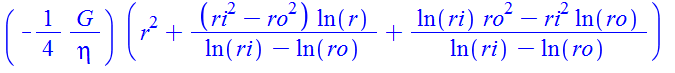 Expr:=-(1/4)*G*r^2/eta-(1/4)*G*(ri^2-ro^2)*ln(r)/(eta*(ln(ri)-ln(ro)))-(1/4)*G*(ln(ri)*ro^2-ri^2*ln(ro))/(eta*(ln(ri)-ln(ro))):