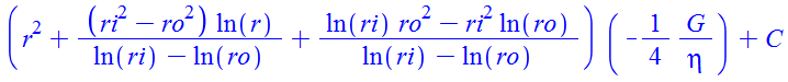 Expr:=-(1/4)*G*r^2/eta-(1/4)*G*(ri^2-ro^2)*ln(r)/(eta*(ln(ri)-ln(ro)))-(1/4)*G*(ln(ri)*ro^2-ri^2*ln(ro))/(eta*(ln(ri)-ln(ro)))+C: