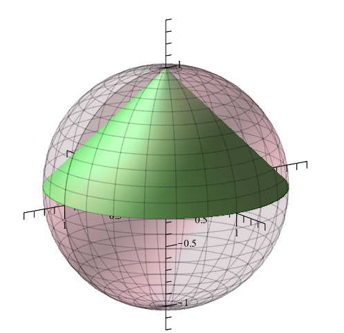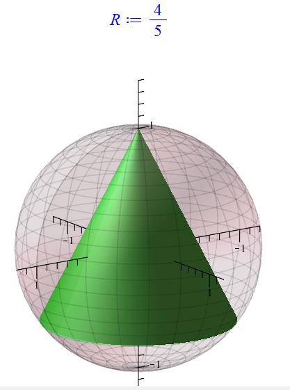 A:=plot3d([r*cos(t), r*sin(t), -sqrt(1-R^2)], r=0..R, t=0..2*Pi, style=surface, color="Green"):  # The base of the cone