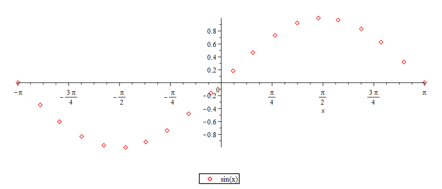 plot(sin(x), x=-Pi..Pi, style=point, color="Red", legend="sin(x)", symbol=diamond, numpoints=20, adaptive=false, scaling=constrained);