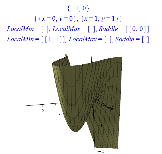Thus we see that  only at the point  [1,1]  the local minimum is reached (the minimum is -1), and the point  [0,0]  is a saddle point. The plot confirms these conclusions.