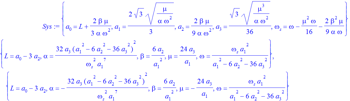 Sys:={a[0]=L+(2*beta*mu)/(3*alpha*omega^2),a[1]=sqrt((4*mu)/(3*alpha*omega^2)),a[2]=(2*beta*mu)/(9*alpha*omega^2),a[3]=sqrt(mu^3/(432*alpha*omega^2)),omega[s]=omega-(mu^2/16*omega)-((2*beta^2*mu)/(9*alpha*omega))};
