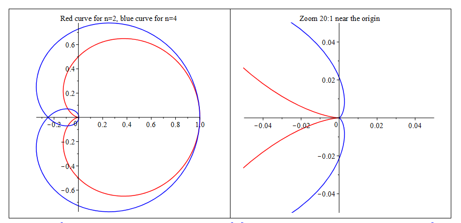 plots:-display(<plots:-display(plot(r1, t=0..2*Pi, coords=polar, color=red), plot(r2, t=0..4*Pi, coords=polar, color=blue), title="Red curve for n=2, blue curve for n=4")| plots:-display(plot(r1, t=0..2*Pi, coords=polar, color=red), plot(r2, t=0..4*Pi, coords=polar, color=blue), view=[-0.05..0.05,-0.05..0.05], title="Zoom 20:1 near the origin")>, scaling=constrained);  # The plots of the curves for n=2 and n=4