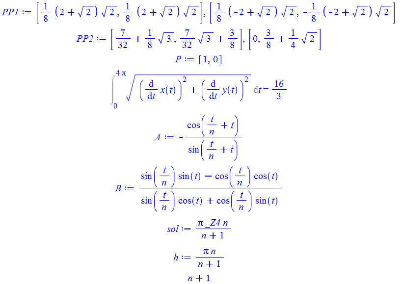 Int(eval([sqrt('diff(x(t),t)'^2+'diff(y(t),t)'^2),t=0..n*Pi],n=4)[])=int(eval([sqrt(diff(x,t)^2+diff(y,t)^2),t=0..n*Pi],n=4)[]);  # The length of the curve for n=4
