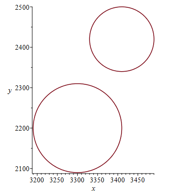 plots:-implicitplot([x^2+y^2-6600*x-4400*y+15730000=12100, x^2+y^2-6820*x-4840*y+17484500=6400], x=3100..3600,y=2000..2500, scaling=constrained, gridrefine=3);