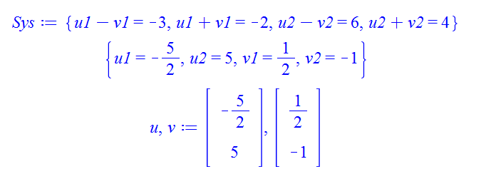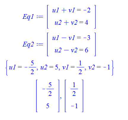 Eq1:=u+v =~ <-2,4>;  Eq2:=u-v = ~<-3,6>;