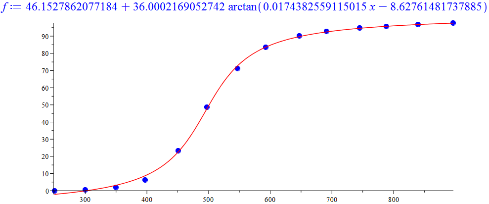 f:=Statistics[NonlinearFit](a+b*arctan(c*x+d),x_val, y_val, x, initialvalues=[a = 50/100, b = 33/100, c = 0.02, d=-12]);  # Model function​​​​​​​