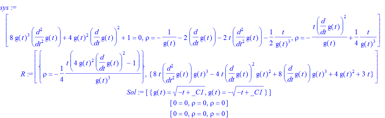 sys:=[8*g(t)^3*diff(g(t),t$2)+4*(g(t)*diff(g(t),t))^2+1=0,rho=-1/g(t)-2*(diff(g(t),t)+t*diff(g(t),t$2))-t/(2*g(t)^3),rho=(-t/g(t))*(diff(g(t),t))^2+t/(4*g(t)^3)];