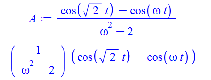 A:=(cos(sqrt(2)*t)-cos(omega*t))/(omega^2-2);