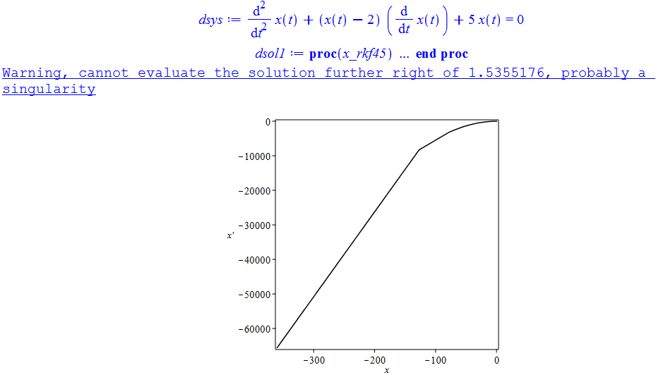 dsys:=diff(x(t),t,t)+(x(t)-2)*diff(x(t),t)+5*x(t)=0;