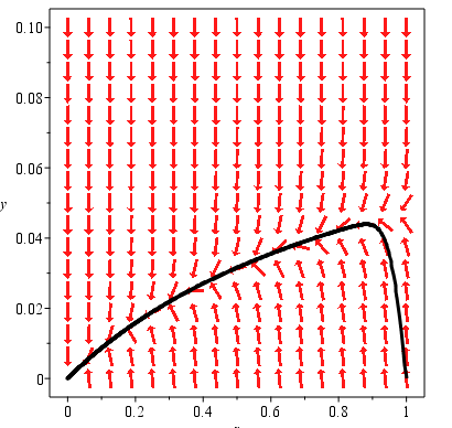 DETools[phaseportrait]([D(x)(t)=-0.4*x(t)+(0.5+4*x(t))*y(t),D(y)(t)=0.4*x(t)-(4.5+4*x(t))*y(t)],[x(t),y(t)], t=0..100, [[x(0)=1,y(0)=0.0]], x=0..1,y=0..0.1, stepsize=0.01, scaling=UNCONSTRAINED, linecolour=BLACK, dirgrid=[17,17], linestyle=1, arrows=mediumfill, axes=BOXED);
