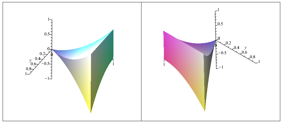 plot3d([-y^2, x^2], x = 0 .. 1, y = 0 .. x, axes = normal, filled, scaling = constrained, orientation = [-65, 65, 0]);