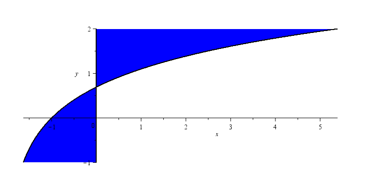plots[implicitplot](x*(y-ln(x+2)) >= 0, x = x1 .. x2, y = -1 .. 2, coloring = [blue, white], filledregions, gridrefine = 5, scaling = constrained);
