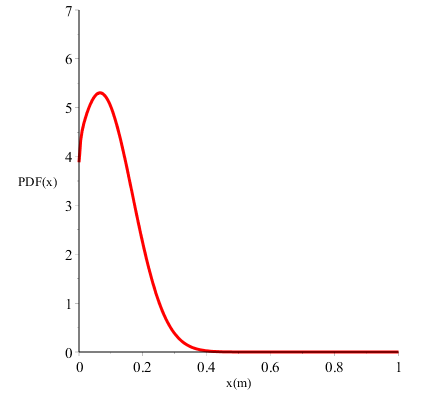 plot((11), x=0..1, y=0..0.4, labels=["x(m)","PDF(x)"], color=red,thickness=3 );