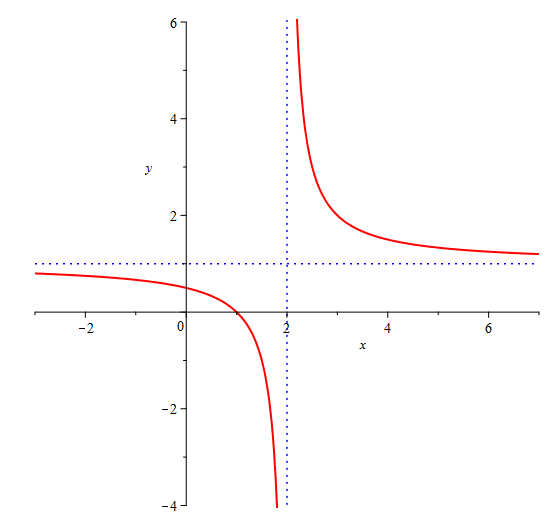 plot([(x-1)/(x-2), [2, t, t = -5 .. 7], 1], x = -3 .. 7, -4 .. 6, color = [red, blue, blue], thickness = [2, 1, 1], linestyle = [1, 2, 2], discont, labels = [x, y]);
