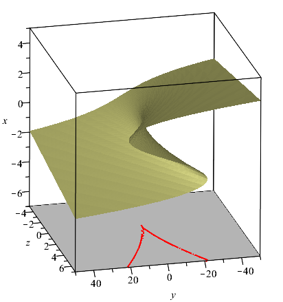 B := plots[intersectplot](x+7 = 0, op(eliminate({f, implicitdiff(f, y, x)}, x)[2]) = 0, x = -7 .. 5, y = -50 .. 50, z = -5 .. 7, color = red, thickness = 4, linestyle = solid):  #  Bifurcation Set