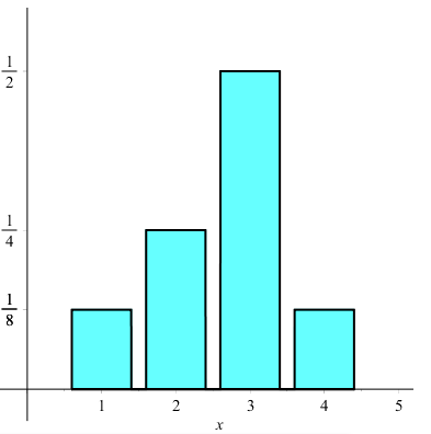 Hist([1, 2, 3, 4], [1/8, 1/4, 1/2, 1/8], 0.8, cyan, [-0.5 .. 5.2, -0.05 .. 0.6]);
