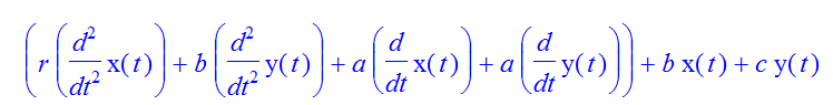 Expr:=a*diff(x(t),t)+b*x(t)+r*diff(x(t),t,t)+a*diff(y(t),t)+b*diff(y(t),t,t)+c*y(t): # The initial expression