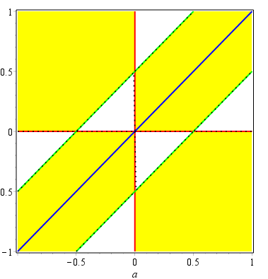 E:=plots[inequal](x<piecewise(a>0 and a<1/2,a-1/2,a>1/2,0), a=0..1, x=-1..0, color=yellow):