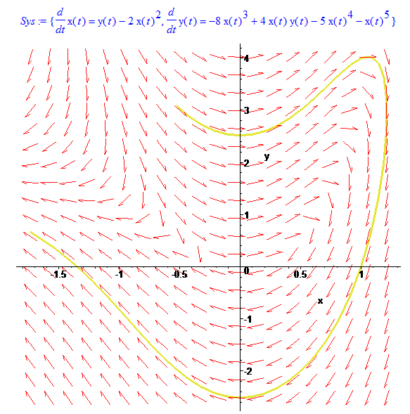 Sys := {diff(x(t),t) = y(t)-2*(x(t))^2, diff(y(t),t) = -8*(x(t))^3+4*x(t)*y(t)-5*(x(t))^4-(x(t))^5};