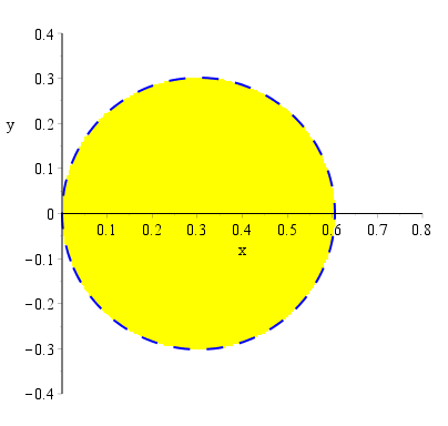 plots[inequal](Expr <= 1, x = 0 .. .8, y = -.4 .. .4, optionsfeasible = [color = yellow], optionsclosed = [color = blue, linestyle = 6, thickness = 2], scaling = constrained);