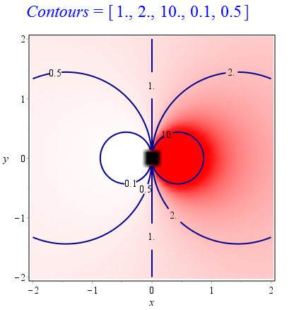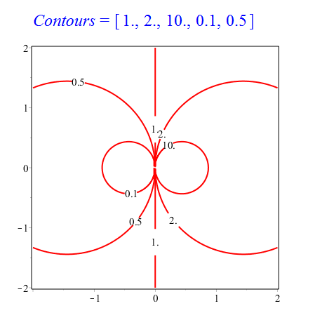 ContoursWithLabels(exp(2*x/(x^2+y^2)), -2 .. 2, -2 .. 2, {1, 2, 10, 0.1, 0.5}, [axes = box, color = red, thickness = 2]);