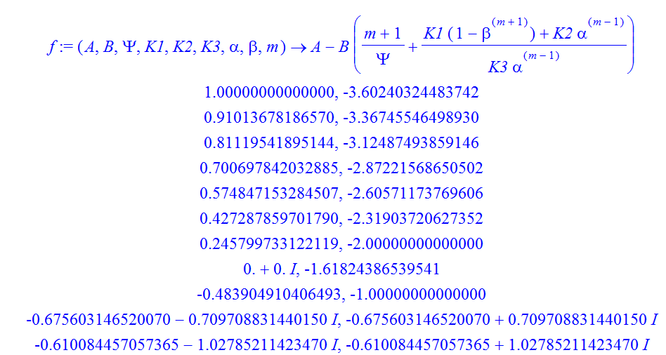 f:=(A,B,Psi,K1,K2,K3,alpha,beta,m) -> A-B*((m+1)/Psi+(K1*(1-beta^(m+1))+K2*alpha^(m-1))/K3/alpha^(m-1));