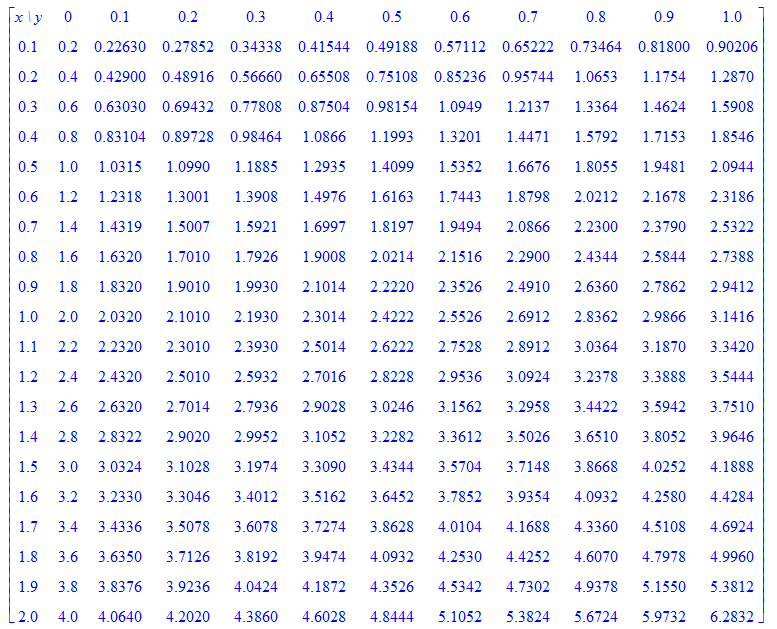 f:=(x,y)->evalf[5](2*x*Int(sqrt(1+y^2*(t*x-1)^2/(1-(t*x-1)^2)), t = 0 .. 1)):