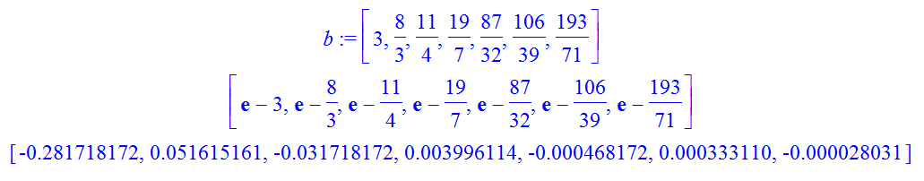 b:=[3, 8/3, 11/4, 19/7, 87/32, 106/39, 193/71];  # b is defined as a list