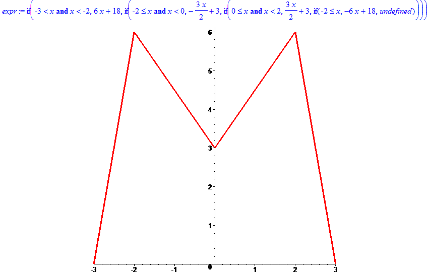 expr:=`if`(x>-3 and x<-2,6*(x+3),`if`(x>=-2 and x<0,-3/2*x+3,`if`(x>=0 and x<2,3/2*x+3,`if`(x>=-2,-6*(x-3),undefined)))):