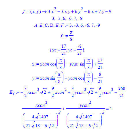 Eq:=simplify(expand(f(x,y)));   # The equation of the ellipse in canonical coordinates