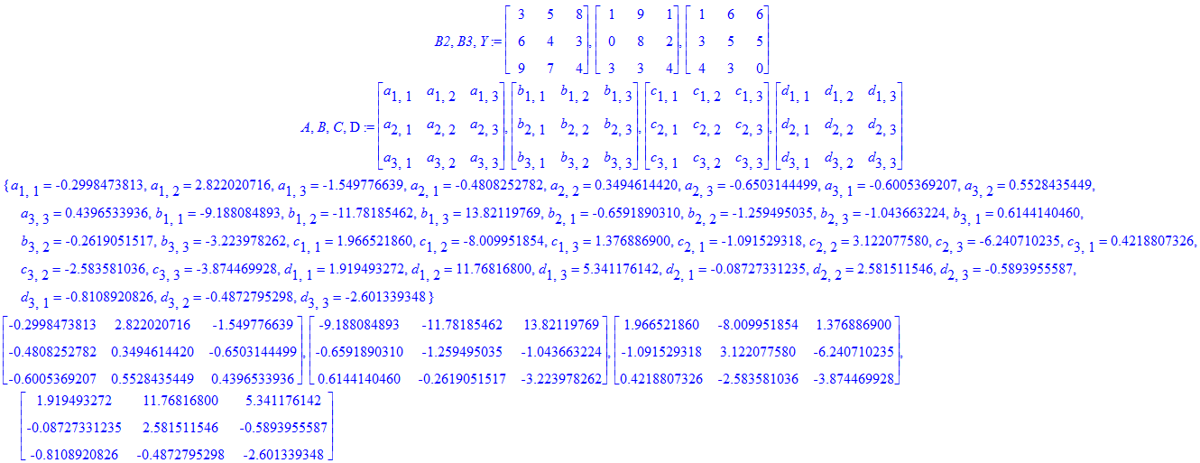 B2, B3, Y:=seq(RandomMatrix(3, generator=0..10), i=1..3);