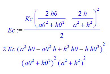 Ec := (1/2)*Kc*(2*Pi*h0/Pi/(a0^2+h0^2)-2*Pi*h/Pi/(a^2+h^2))^2;
