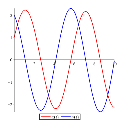 plot([x,y], 0..10, color=[red,blue], thickness=2, legend=['x(t)','y(t)']);
