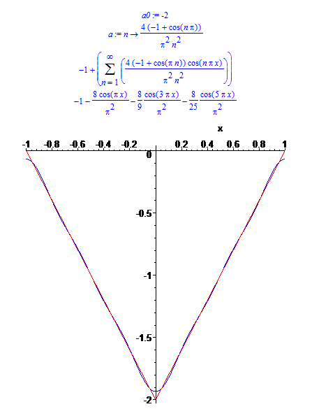 a0/2+Sum(a(n)*cos(n*Pi*x/l), n=1..infinity);    # Fourier series for even expansion of f(x)=2*x-2