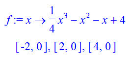f:=x->1/4*x^3-x^2-x+4;