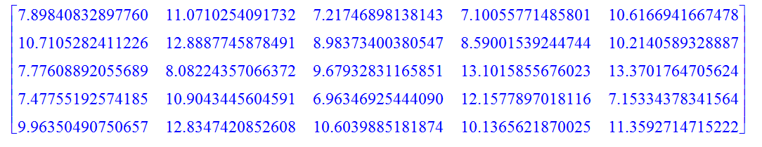Matrix(5, RandomTools[Generate](distribution(Normal(10,3)), makeproc=true));