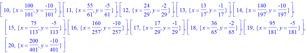 seq([b,solve({x+b*y=0, b*x-y=10},{x,y})], b=10..20);