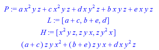 P:=a*x^2*y*z+b*x*y*z+c*x^2*y*z+d*x*y^2*z+e*x*y*z;