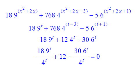 A:=18*9^(x^2+2*x)+768*4^((x+3)*(x-1))-5*6^((x+1)^2):