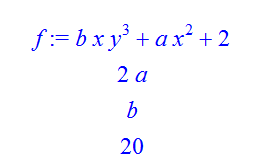 The procedure  coefff  returns the coefficient of the monomial  t  in the multivariate polynomial  P (T - the list of variables of the polynomial). The procedure works with both numeric and symbolic  coefficients.