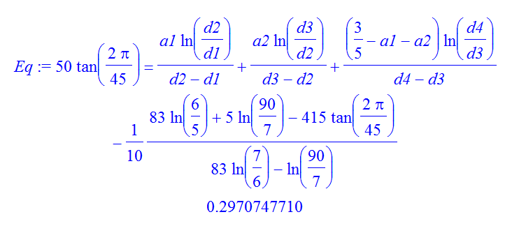 Eq:=50*tan(8*Pi/180)=(a1/(d2-d1))*ln(d2/d1)+(a2/(d3-d2))*ln(d3/d2)+((6/10-a1-a2)/(d4-d3))*ln(d4/d3);