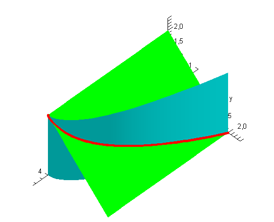 A := plots[spacecurve]([-y^2+4, y, 2-y], y = 0 .. 2, color = red, thickness = 3):