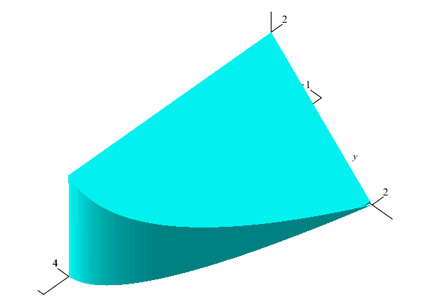 C := plot3d([-y^2+4, y, z], y = 0 .. 2, z = 0 .. 2, color = cyan, style=surface):