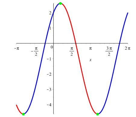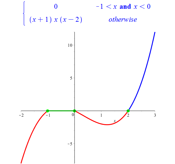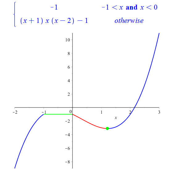 cplot1(f, -2 .. 3);    # Green color - the points in which the derivative is equal to zero