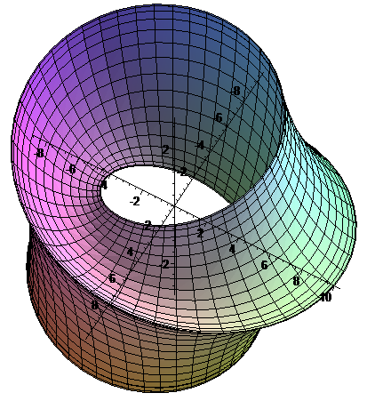 sin(u/3-2*v)+2*sin(u/3+v)], u=-Pi..Pi, v=-Pi..Pi,  axes=normal, orientation=[30,30], lightmodel=light4);