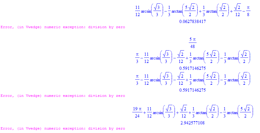 Vwedge :=(R,a,b)->-( (1/3)*Pi*R^3-(1/6)*Pi*(2*R+a)*(R-a)^2-(1/6)*Pi*(2*R+b)*(R-b)^2-(1/3)*a*(3*R^2-a^2)*arcsin(b/sqrt(R^2-a^2))-(1/3)*b*(3*R^2-b^2)*arcsin(a/sqrt(R^2-b^2))-(2/3)*a*b*sqrt(R^2-a^2-b^2)+(1/3)*R^3*arctan((R^2+R*b-a^2)/(sqrt(R^2-a^2-b^2)*a))-(1/3)*R^3*arctan((R^2-R*b-a^2)/(sqrt(R^2-a^2-b^2)*a))):