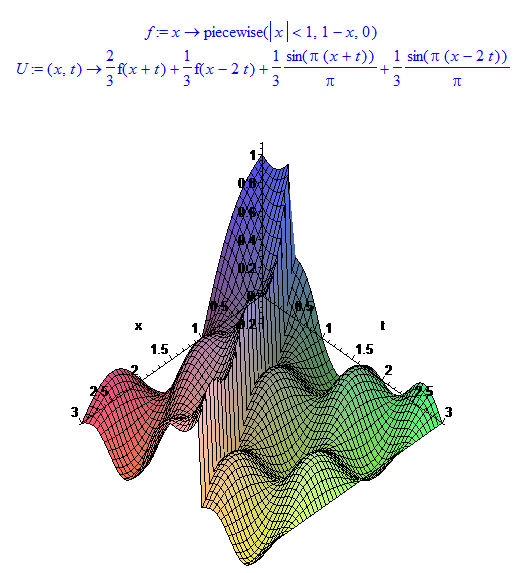 U := (x,t)->2/3*f(x+t)+1/3*f(x-2*t)+1/(3*Pi)*sin(Pi*(x+t))+1/(3*Pi)*sin(Pi*(x-2*t));