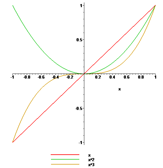 plot([x,x^2,x^3], x=-1..1, thickness=2, legend=[x,x^2,x^3]);