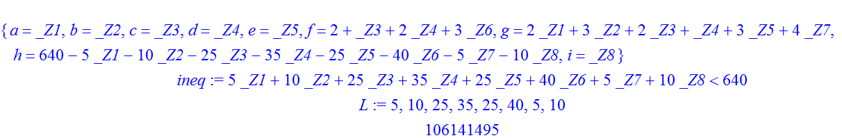 ineq:=5*_Z1+10*_Z2+25*_Z3+35*_Z4+25*_Z5+40*_Z6+5*_Z7+10*_Z8<640;
